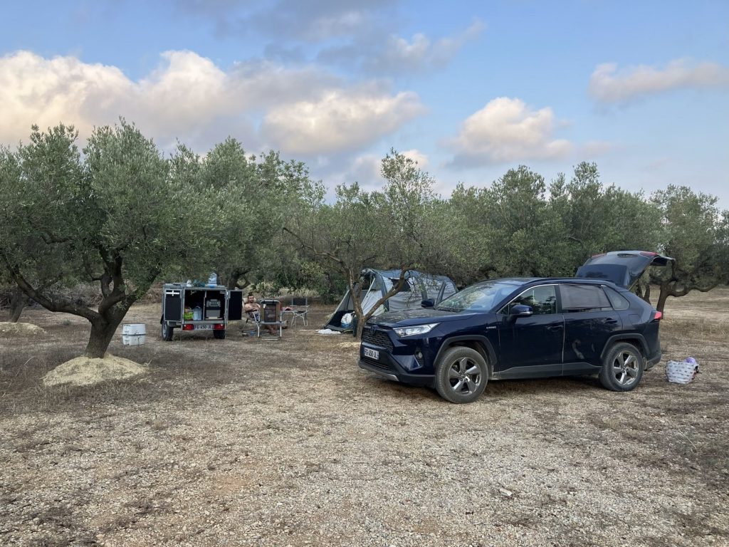 On s’installe donc à 16h dans une oliveraie bio de 10 hectares, pour 10 emplacements. Autant dire qu’on ne manque pas de place ! Le pauvre Cookie est triste par contre, il y a des chardons secs partout, il s’en met plein les pattes et n’arrive pas à faire 3 pas sans boîter … On passe une petite soirée tranquille au milieu des oliviers. Le seul hic, un camp de scout venu pour la nuit qui squatte les toilettes/salle de bain jusqu’à 23h, mais assez gentils pour laisser la place à Manon à chaque fois qu’elle en a eu besoin.