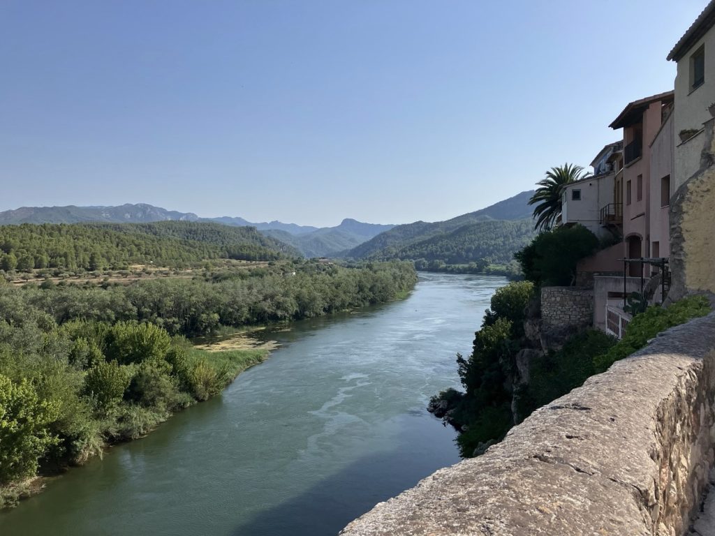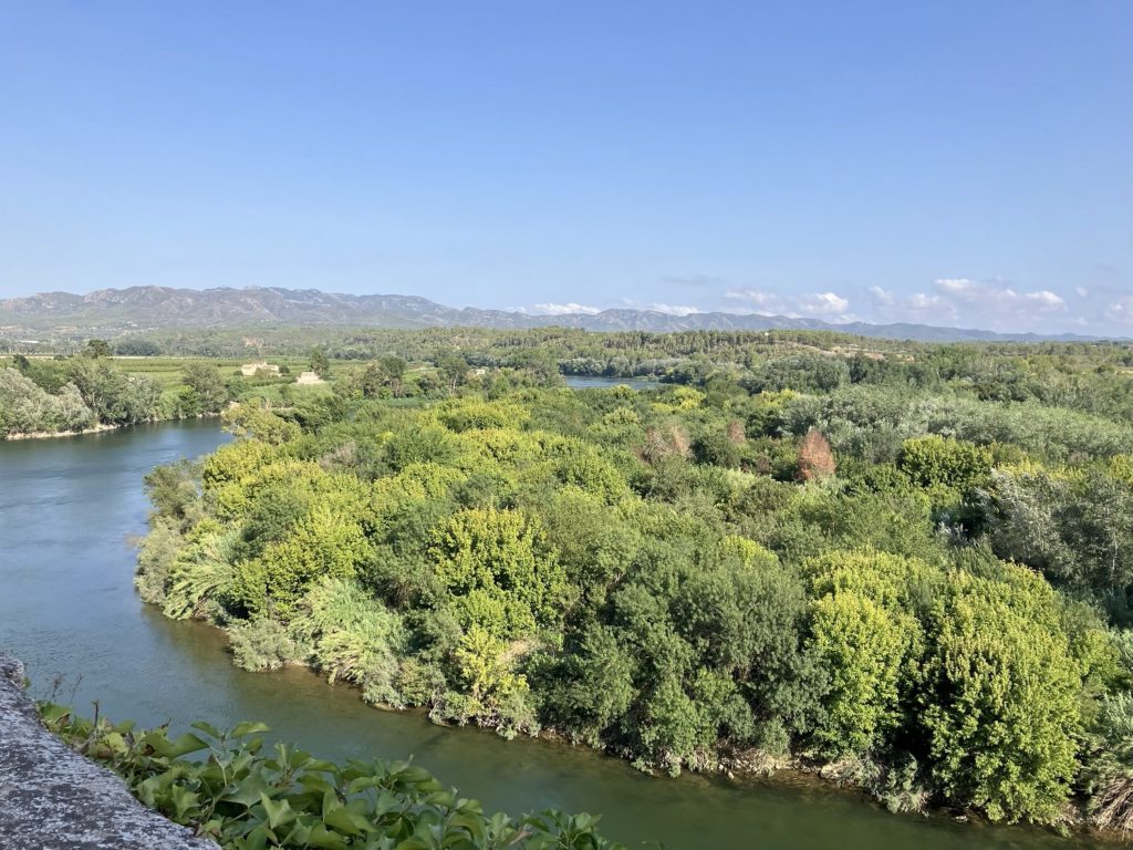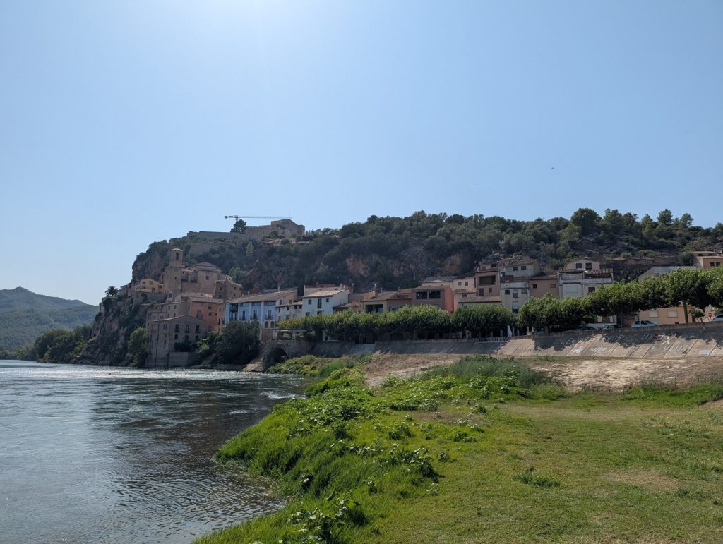 On prend ensuite la direction de Miravet, un beau village de la région. Comme d’hab, on commence par la pause à l’aire de jeux. Mais on prend aussi un peu le temps pour Cookie de se baigner dans le fleuve, avec vue sur le village c’est magnifique. On va ensuite le visiter (au moins 15 min de marche, Manon s’améliore !). Très mignon avec de très belles vues sur le fleuve, c’est top ! En plus au retour, on tombe sur un marchand de fromage ambulant, alors on craque …